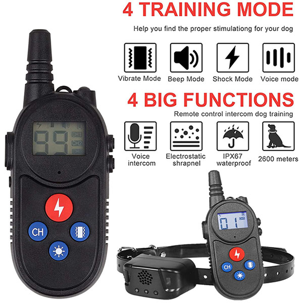 4 training modes:Use built-in walkie-talkie,buzzer,vibration and electric shock to train in 4 modes.The level range of vibration and electric shock mode is 1-99.And can be personalized training,which allows you to choose the best mode for your dog.Note:The electric shock mode is only suitable for very stubborn dogs,and the electric shock level should be adjusted to the lowest level when using it,and then step by step until the dog reacts to it.